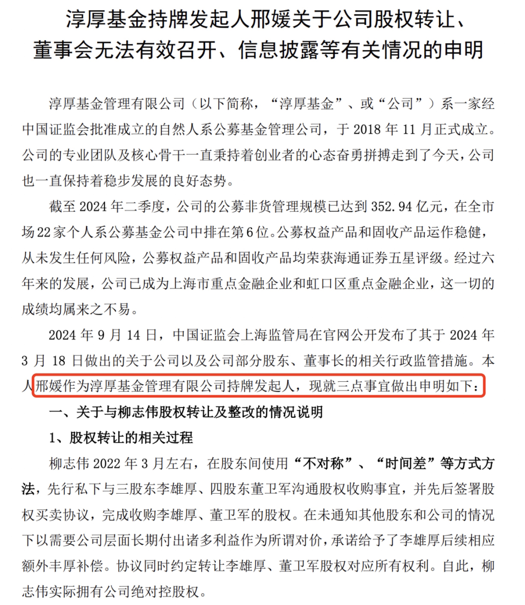 据邢媛介绍,2024年3月18日,中国证监会上海监管局对身份证33010619671020****的柳志伟做出了行政监管措施,因其与多人签订淳厚基金股权转让协议并支付股权转让款,严重影响公司股权结构和公司治理稳定,对公司运作产生重大影响,责令柳志伟整改并且转让其持有的股权。